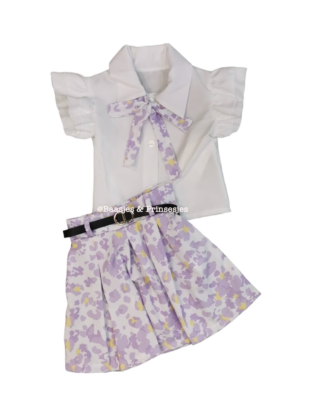 Dit leuke meisjes setje bestaat uit een blouse met bijpassende rok valt goed op maat
