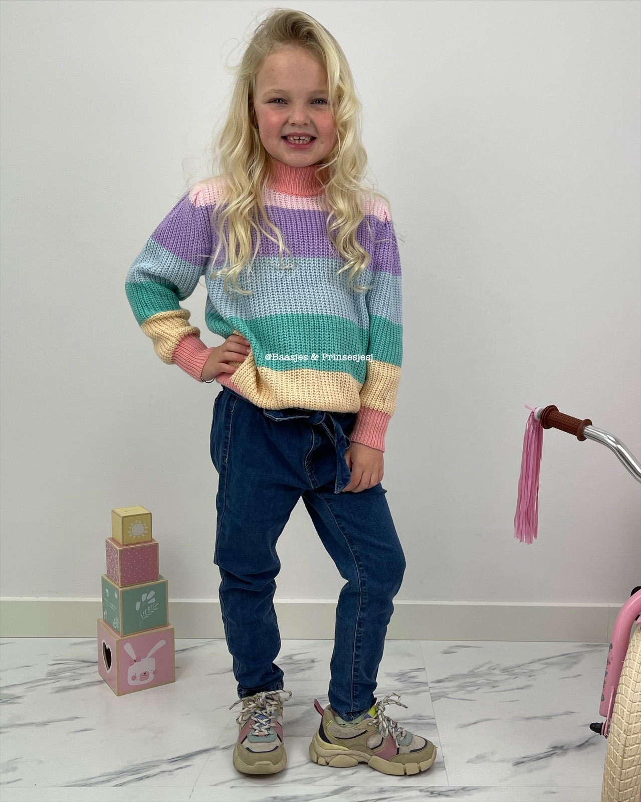 Een prachtige en warme gebreide trui in een mooie lichte kleur! Combineer hem met een mooie spijkerbroek en jou prinsesje is klaar voor het voorjaar!
