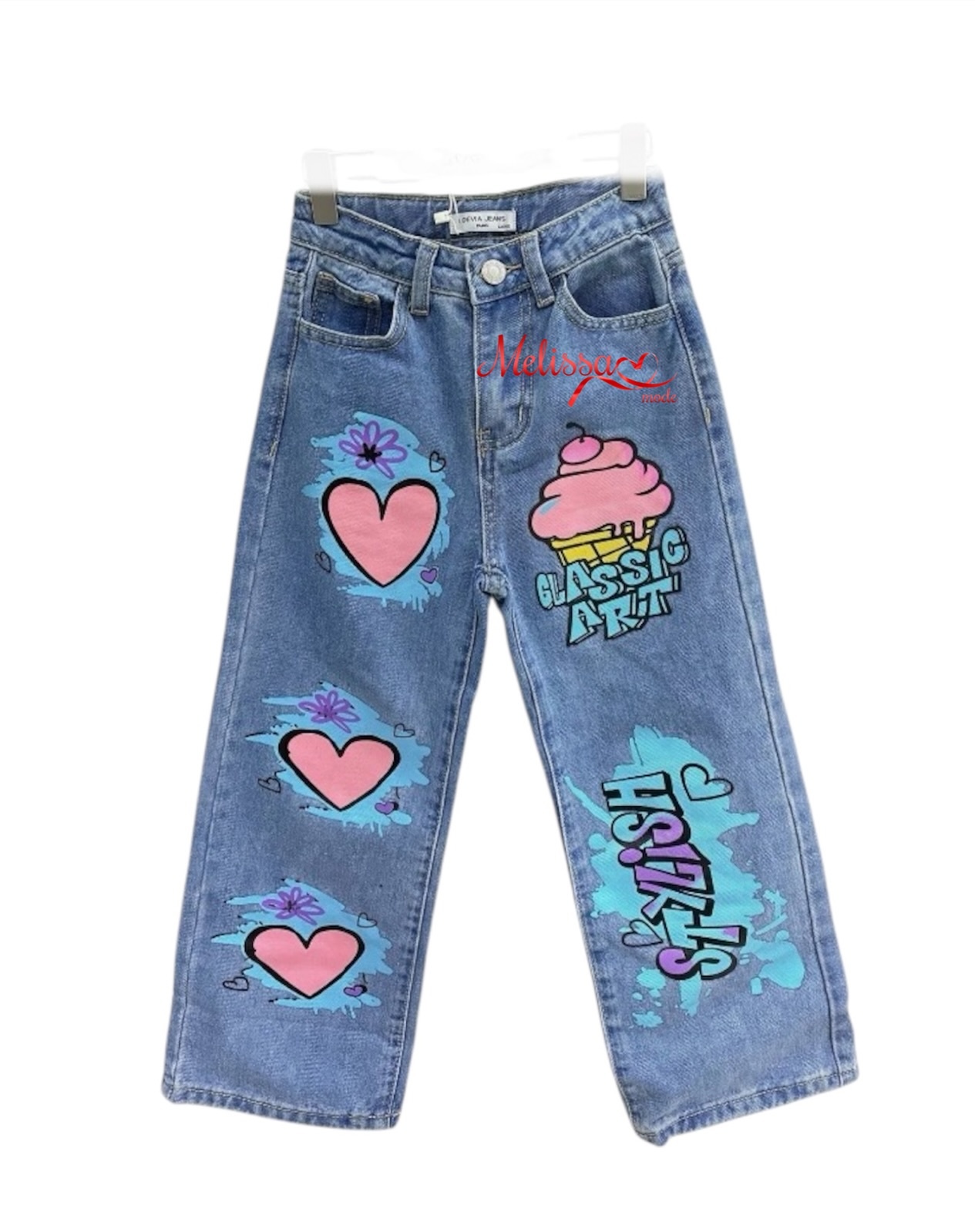 Dit leuke wide meisjes jeans broek heeft bloemen aan de voorkant en valt goed op maat ze gaan vanaf maat 104 t/m 164